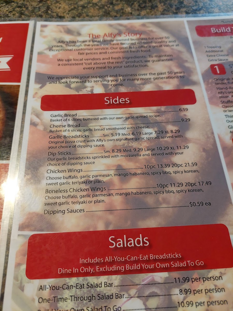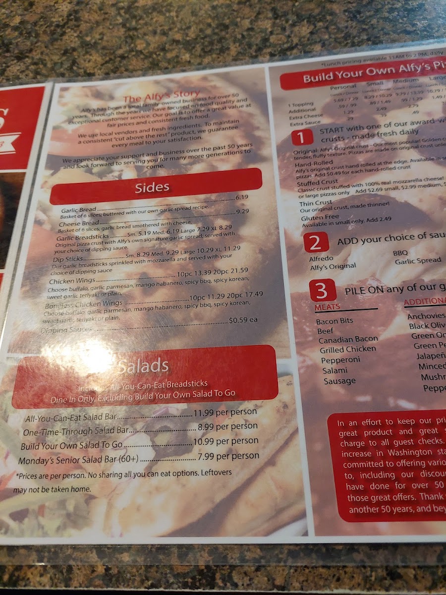 Welcome to Alfy's Pizza, a delightful pizza haven located in Marysville, Washington. This beloved eatery offers a diverse menu designed to satisfy every craving. The standout feature is the Build Your Own Pizza option, allowing guests to create personal masterpieces starting at a mere $6.30. Whether you prefer a classic cheese or a thrilling combination of toppings, the customization options are endless.